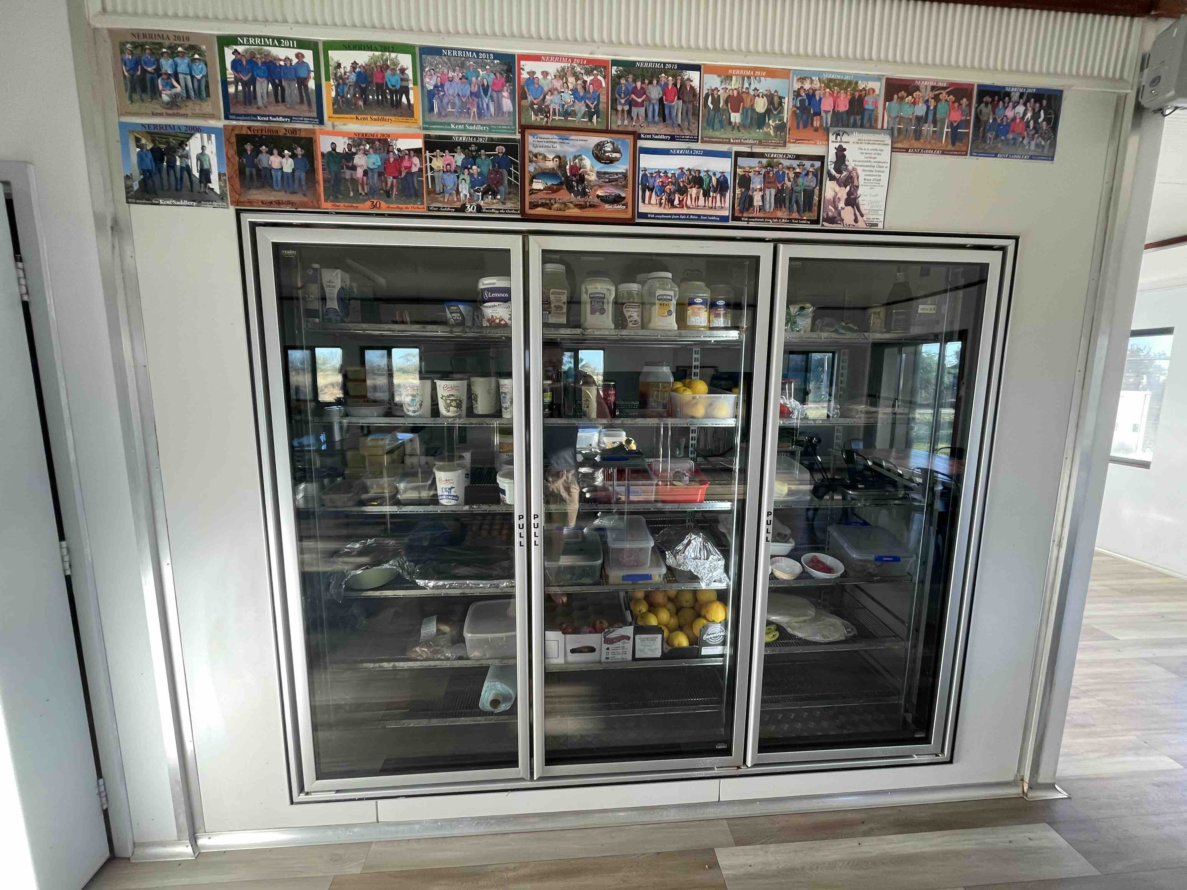 On a few trips with Gus Rose taking horses to cattle stations in his road train - we had a couple of stay overs at Nerrima Station in the West Kimberley - and were always warmly greeted and looked after by Managers, Chris and Bec Morrow (and little Georgina); Gus and I would always put on a few 'kegs' after being very well fed by the Nerrima Cook, Poppy Spurling. Here's a shot of her extremely orderly kitchen fridge - smoko on hand 24/7!